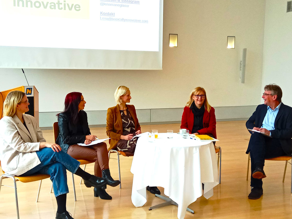 Im Anschluss an das Referat nutzten die Teilnehmer*innen die Zeit für direkte Nachfragen und anregende Pausengespräche mit Frau Glaser. Danach waren Vertreter*innen der NÖ-Erwachsenenbildung und des NÖ Arbeitsmarktes gemeinsam mit der Referentin eingeladen, ihre Erfahrungen und Einschätzungen zu den vorgetragenen Themen einzubringen. Gerald Danner, der Vorsitzende des FEN, begrüßte dazu Sandra Kern (AMS NÖ), Anna Biribauer (bfi NÖ) und Therese Reinel (BhW NÖ) auf dem Podium. Eine aktuelle Sicht auf den niederösterreichischen Arbeitsmarkt, die Veränderungen in der allgemeinen und beruflichen Bildungslandschaft waren hier die Themen, ebenso wie das Bemühen, benachteiligte Menschen nicht zu verlieren, die Hoffnung New Work könnte das Ehrenamt wieder beflügeln sowie die Notwendigkeit, dass Weiterbildung für alle leistbar bleibt.